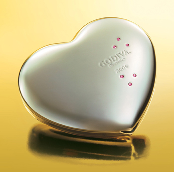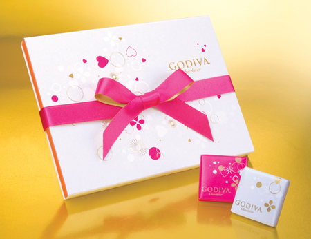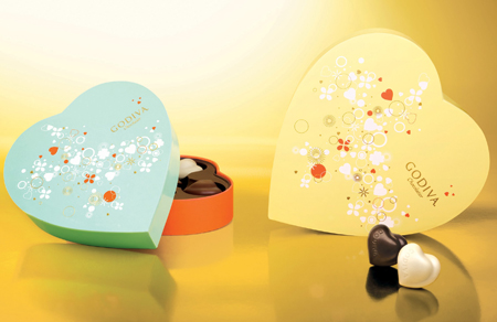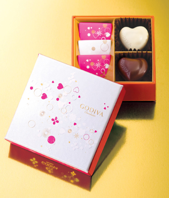 GODIVA珍珠白的五顆裝禮盒,以桃紅與粉橘飾邊,適合勇於表白的情人;水藍色的愛心禮盒,象徵淡淡的愛戀物語,獻給害羞的另一半;粉黃色的愛心禮盒,為平凡的關係增添驚喜感;設計精巧的銀色禮盒,為堅貞的愛情締造永恆;全新口味的片裝禮盒,讓每個人體驗愛情的美妙滋味。